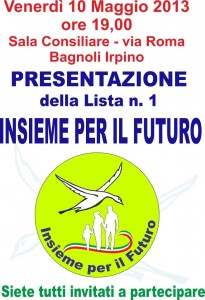 La lista n° 1, capeggiata da Chieffo, inizia la propria campagna elettorale sistematicamente inserendo la nuova, ma anche la vecchia, squadra; infatti, moderatrice e presentatrice era l’ex assessore Incoronata Vivolo. Organo di spicco nell’ amministrazione Chieffo, che ha contribuito allo sviluppo del Laceno e dell’organizzazione del Giro d’Italia. «Parliamo del Futuro che darà risposte come la politica- dice Vivolo- e quindi vado a presentarvi i candidati»; intervengono tutti e tutti dicono la propria. A partire dagli assessori uscenti che hanno deciso di mettersi di nuovo in gioco e di portare a termine progetti voluti fortemente, come Luca Branca, assessore all’agricoltura e Giuseppe Caputo, assessore alle politiche sociali. Si è passata poi la parola agli inesperti, ma volenterosi “nuovi candidati”: Tommaso Boccia, Alejandro Antonio Di Giovanni, Angiolina Di Capua, Dario Di Mauro e Giulio Tammaro. Gli interventi di questi nuovi volti portano a terminare la seduta con il candidato a sindaco l’avv. Aniello Chieffo. «Sono in mezzo-dice Chieffo- tra i giovani e i vecchi e vorrei trasmettere loro il peso della sfida e l’impegno per il paese», esprimendo così il proprio slogan che lo ha accompagnato per cinque anni e cioè che la macchina amministrativa ha il brutto vizio di affossare le cose fatte, ma cerca di accogliere le nuove idee. «Voglio la continuità di questa grandissima Onestà-conclude Chieffo- ma voglio dire alla popolazione bagnolese che sono per il “rinnovamento” e per i “grandi progetti”».
