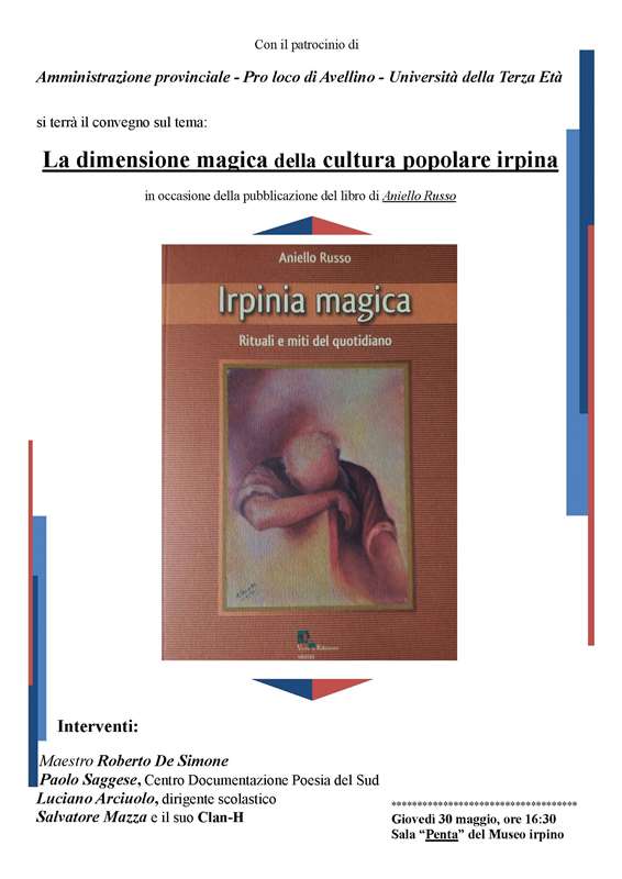 Giovedì 30 maggio, alle ore 16:30, nella sala “Penta” del Museo irpino ad Avellino, con il patrocinio di Pro loco di Avellino, Amministrazione provinciale e Università della Terza Età, si presenterà il volume “Irpinia magica, rituali e miti del quotidiano” di Aniello Russo.