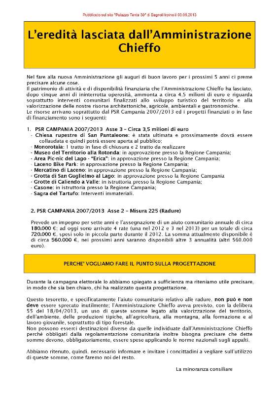 Il patrimonio di attività e di disponibilità finanziaria che l’Amministrazione Chieffo ha lasciato, dopo cinque anni di ininterrotta operosità, ammonta a circa 4,5 milioni di euro e riguarda soprattutto interventi comunitari finalizzati allo sviluppo turistico del territorio e alla valorizzazione delle nostre risorse architettoniche, agricole, ambientali e gastronomiche.