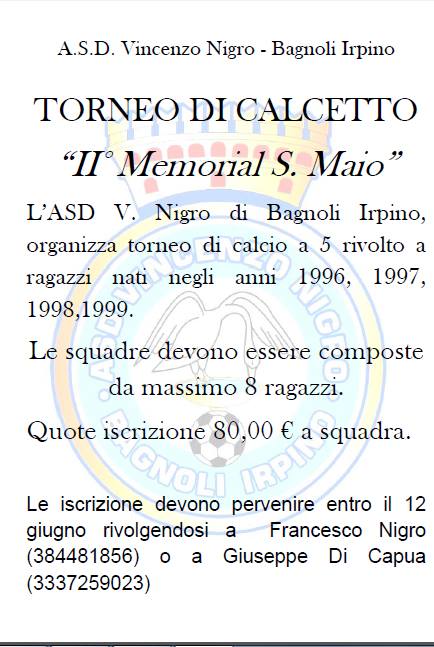 L’A.S.D. Vincenzo Nigro di Bagnoli Irpino organizza il TORNEO DI CALCETTO “II Memorial Salvatore Maio” rivolto ai ragazzi nati negli anni 1996, 1997, 1998, 1999. Le squadre devono essere composte da massimo 8 ragazzi. Quota di partecipazione: 80,00 € a squadra. Le iscrizione devono pervenire entro il 12 giugno rivolgendosi a Francesco Nigro (384481856) o a Giuseppe Di Capua (3337259023).