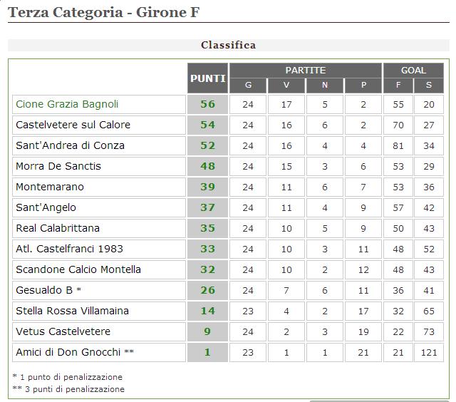 Trionfo finale del Cione Grazia che superando nell’ultima giornata del Girone F il Gesualdo si guadagna l’accesso per l’anno venturo alla Seconda Categoria ed entra di diritto nella storia sportiva di Bagnoli Irpino. Trattasi di vera e propria impresa quella compiuta dai ragazzi del Cione Grazia, associazione costituitasi meno di due anni fa e, dopo un campionato di rodaggio, capace di centrare al primo vero tentativo il salto di categoria.