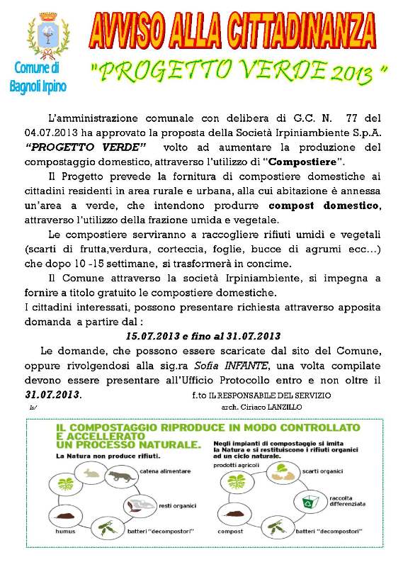 L’amministrazione comunale con delibera di G.C. N. 77 del 04.07.2013 ha approvato la proposta della Società Irpiniambiente S.p.A. “PROGETTO VERDE” volto ad aumentare la produzione del compostaggio domestico, attraverso l’utilizzo di “Compostiere”.