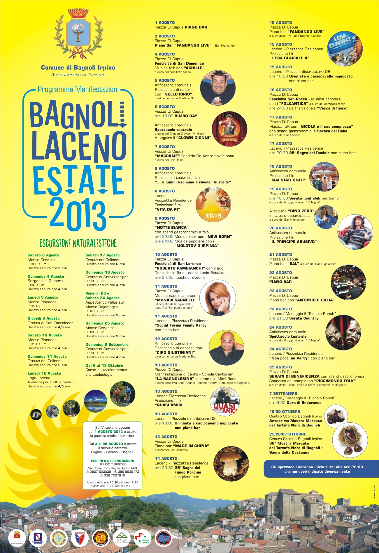 L’Amministrazione Comunale di Bagnoli Irpino, Assessorato al Turismo, ha presentato ufficialmente il programma completo delle manifestazioni “Bagnoli-Laceno Estate 2013″. Il palinsesto prevede tanta musica con le covery di Ligabue (Fandango Live), Fabrizio De Andrè (Macramè), Lucio Battisti (Roberto Pambianchi), e diverse serate con il piano bar.