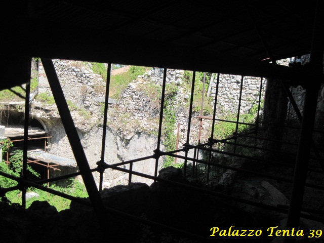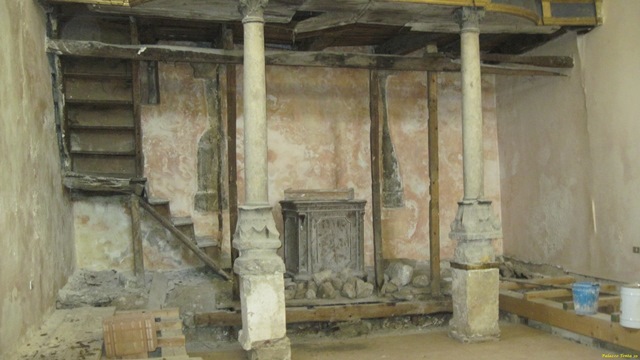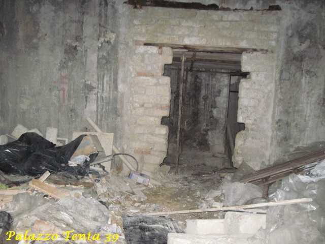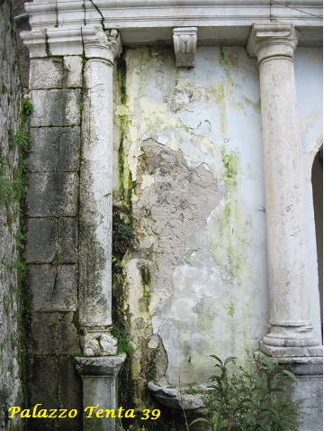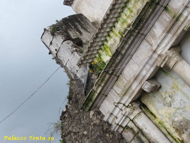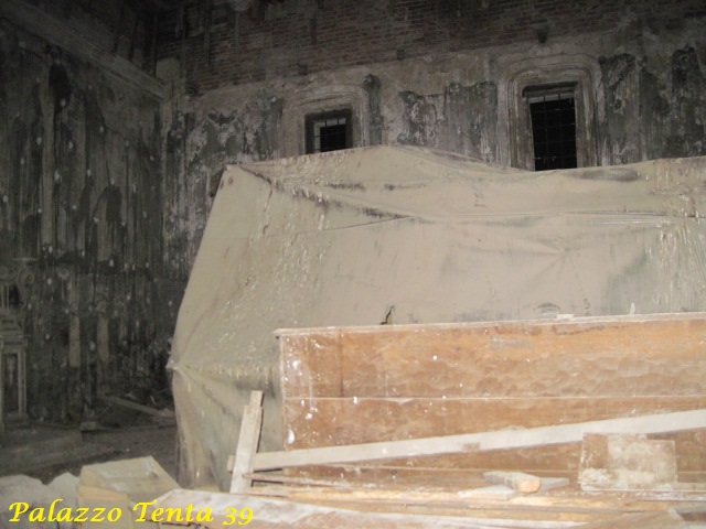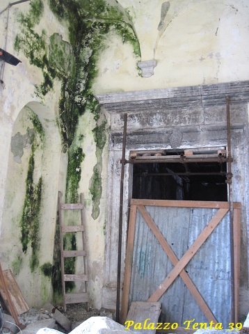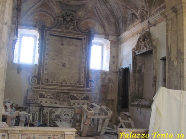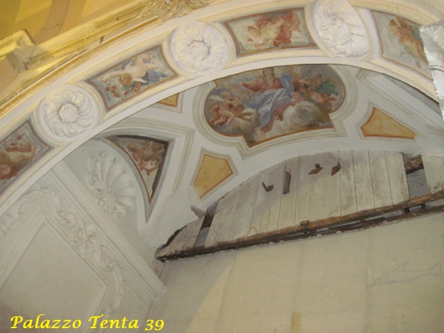 L’ingresso alla destra del portone della chiesa è chiuso da un pezzo di lamiera e dinanzi si trovano gettate le pietre del portale del convento di S.Rocco! Quella porta conduce in un’ambiente in cui il soffitto è retto dall’impalcatura e in cui a terra scorre l’acqua. Conduce a destra al chiostro e di fronte a due stanzoni colmi di rifiuti edili! Nella facciata del monastero c’è una vecchia fontana sfregiata come le sei colonne, sulla trabeazione si notano infiltrazioni e muschio. Entrando nella chiesa si osserva subito come il soffitto sia stato restaurato (in parte), ma dei quadri che vi si trovavano non ve n’è traccia. Gli interni sono stati tinteggiati di rosa e giallo. L’altare in marmo scuro appena entrati alla sinistra sembra quasi sventrato e alla sua destra c’è un’apertura che come la cappella nel transetto sinistro è stata riempita di spazzatura.