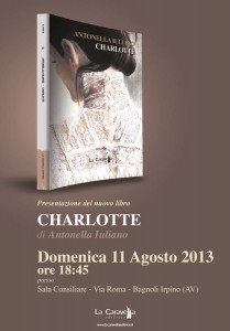 L’Associazione socio-culturale “Palazzo Tenta 39″ PRESENTA il nuovo romanzo di Antonella Iuliano “CHARLOTTE”, edito da La Caravella Editrice. L’appuntamento è per domenica 11 agosto, alle ore 18:45, presso la Sala Consiliare (ex Santa Caterina) in Via Roma a Bagnoli Irpino.
