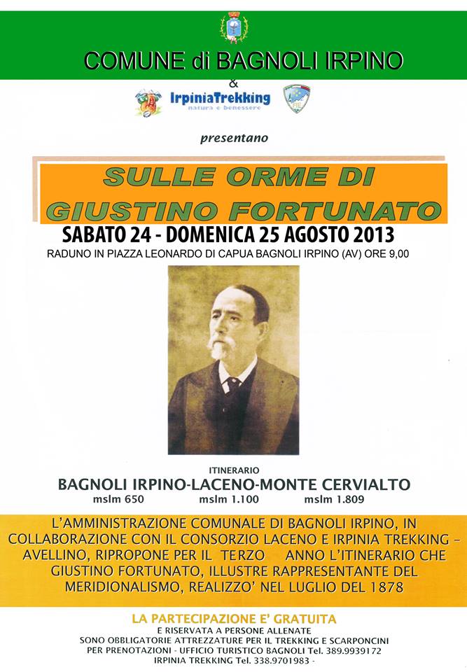 Si ripropone, per il terzo anno consecutivo, l’tinerario che Giustino Fortunato, illustre rappresentante del MERIDIONALISMO, realizzò nel luglio del 1878. La partecipazione è gratuita ed è riservata a persone allenate. Sono obbligatorie attrezzature per il trekking e scarponcini. Per prenotazioni:  UFFICIO TURISTICO BAGNOLI Tel. 389.9939172 – IRPINIA TREKKING  Tel. 338.9701983.