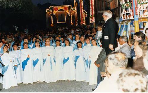 Camminava borbottando un’aria di musica lirica; gonfiava le gote e rispondeva talora con un cenno del capo al saluto di quanti incontrava lungo il percorso da San Rocco, dove abitava, fino alla biblioteca del Casale. Un giorno all’anno aveva il suo momento di prestigio e di gloria cittadina. Levato su una sedia in piazza, in mezzo alla folla dei fedeli e sotto lo sguardo sorridente della Madonna alta sul carro, mentre la folla ammutoliva, dava l’avvio all’esecuzione del canto delle verginelle. Le sue mani si muovevano nell’aria leggere come le note della melodia che si spandevano intorno nel silenzio della Piazza. L’applauso finale interrompeva le tensione: quello era il suo momento di estasi interiore.