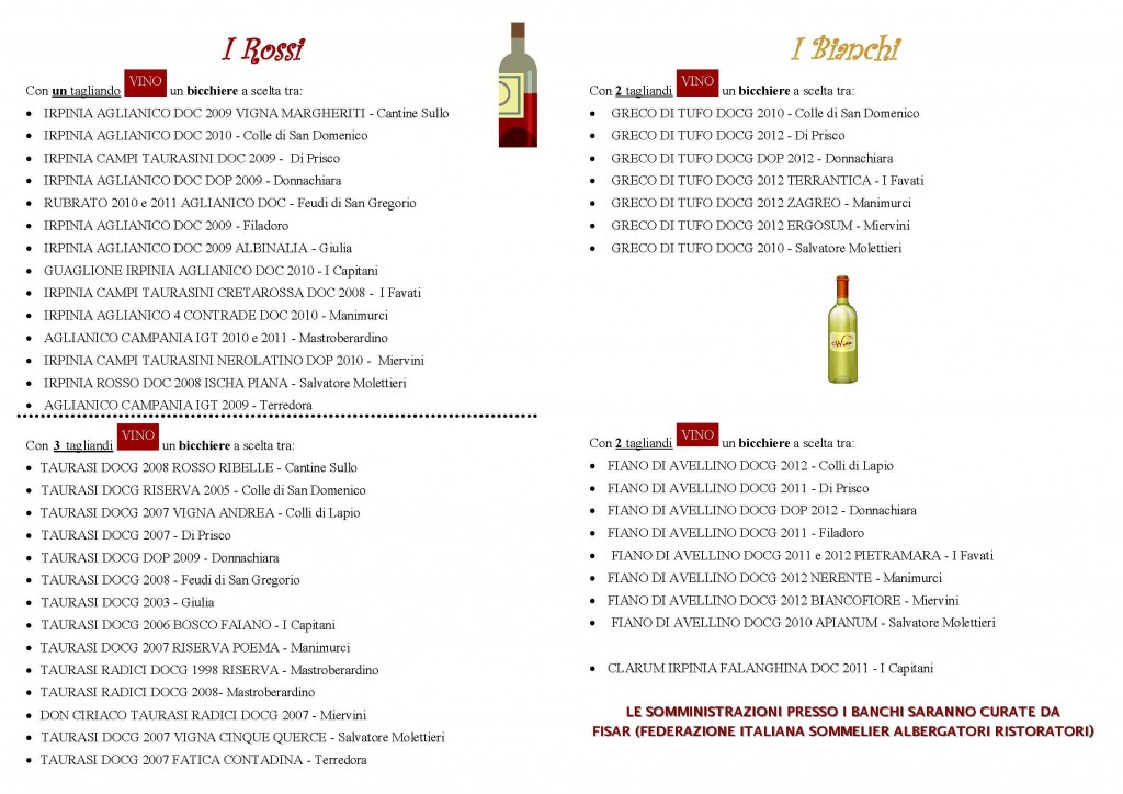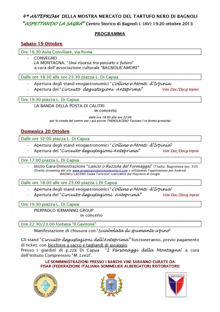 Oltre al connubio tra il tartufo bagnolese e i grandi vini irpini (Taurasi, Fiano di Avellino e Greco di Tufo), ci saranno gli altri prodotti del luogo a deliziare i visitatori.