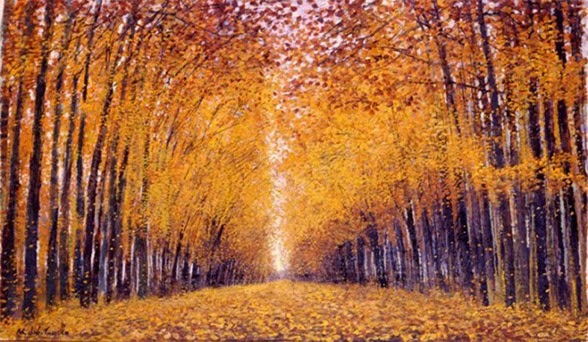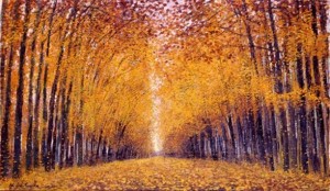 Distese ai margini, / abbattute, / a terra riposano / d’arancio e cremisi / sfumate, / esse che in alto / ebbero casa. / Un dì frondose, fruscianti / lamelle di vita. / Tappeto amaranto / scricchiola / sotto le suole. / All’occhio errante, / in lontananza / si restringe la via / fino a morire / in un misero punto. / Fermo il poeta / tra le morte foglie, / fissa lì in fondo la sua / inquietudine. / Distoglie lo sguardo, / rovescia il capo, / fugge il suo demone. / Ed ecco sulla testa / fulve chiome / si accarezzano al vento. / Sul suo capo condannato: / un boulevard azzurro / lentamente si apre / tra nodose increspature, / come una serpe di cielo. / Disarmata, / l’ammaliata pupilla / s’ immerge tra celesti voluttà.