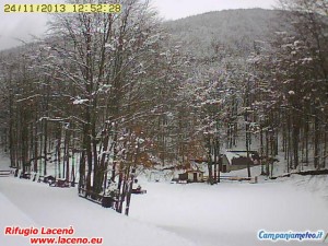 Intanto, già in queste ore, è caduta la prima neve. Dopo la spolverata di ieri notata sulle cime del Terminio e di Montevergine, questa mattina, il bollettino della coltre bianca al Laceno fa registrare da 5 (a valle) a 30 centimetri (in vetta), come testimonia la foto della webcam (fonte laceno.eu, e quelle dalla pagina facebook di laceno.net.) Previste nevicate per l’intera giornata da quota 1.100 metri. Piste ancora chiuse, aperte le seggiovie panoramiche.