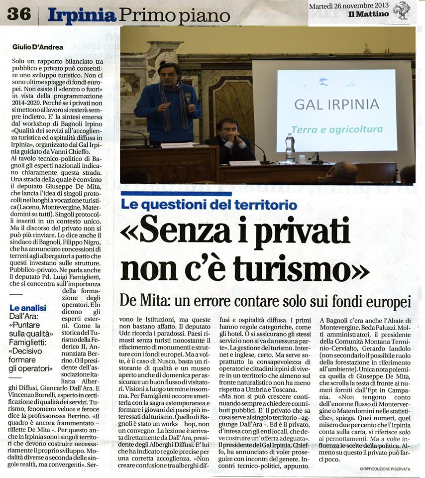 Giancarlo Dall’Ara ha spiegato nei dettagli la finalità dell’albergo diffuso: ” è un modello di sviluppo dei territori. Dal punto di vista dei servizi è un albergo a tutti gli effetti, con la particolarità che non si costruisce ma nasce mettendo in rete case preesistenti e molto vicine tra loro, che danno vita ad un albergo orizzontale. Un modello di sviluppo compatibile pensato per i borghi che qui in Irpinia non mancano e vero attrattore turistico”.
