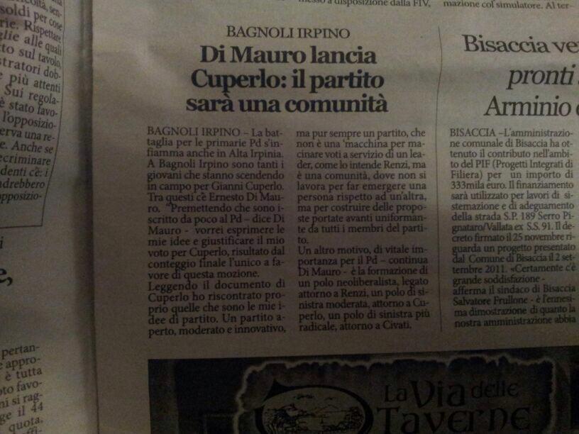 Leggendo il documento di Cuperlo ho riscontrato proprio quelle che sono le mie idee di partito. Un partito aperto, moderato e innovativo. Ma pur sempre un partito, che non è una ‘’macchina per macinare voti’’ a servizio di un leader, come lo intende Renzi, ma è una comunità, dove non si lavora per far emergere una persona rispetto ad un’altra, ma si lavora per costruire delle proposte portate avanti uniformante da tutti i membri del partito.