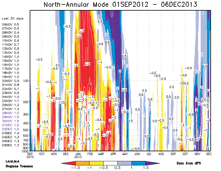 Alcuni studiosi hanno evidenziato che dal momento in cui il NAM raggiunge la soglia di + 1.5 (raggiunta a fine novembre) passano fra i 45/60 giorni affinchè si realizzi il cambio atmosferico spiegato prima. Un’attuale difficoltà comunicativa fra il VPS e quello troposferico ci fa pensare che la tempistica possa portarci verso la metà di gennaio al massimo all’inizio della terza decade del mese di gennaio, quando il quadro meteorologico potrebbe far “rientrare” l’inverno nella sua naturale stagione.