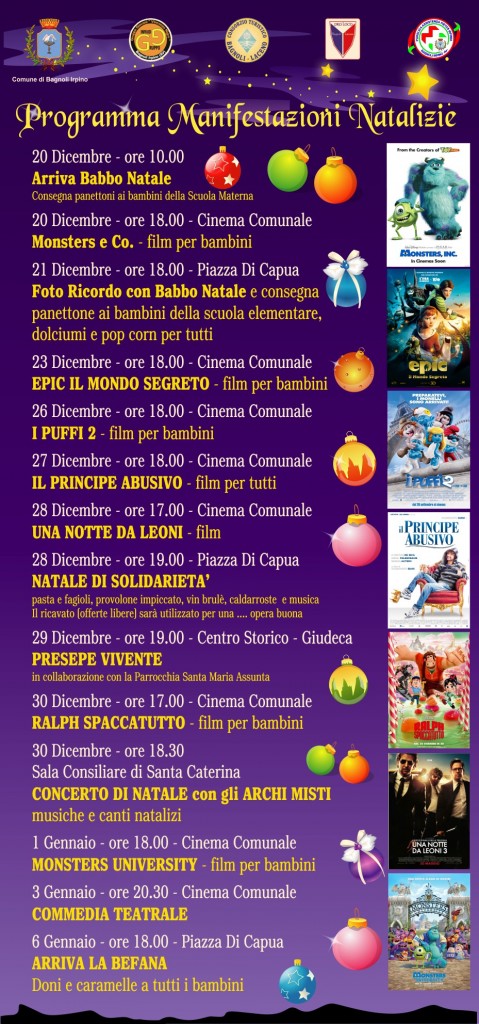 Il 3 gennaio una Commedia Teatrale presso il Cinema Comunale, a cura del Gruppo Giovani. Chiusura il 6 gennaio in Piazza Di Capua con la manifestazione “Arriva la Befana”: verranno distribuiti doni e caramelle a tutti i bambini.