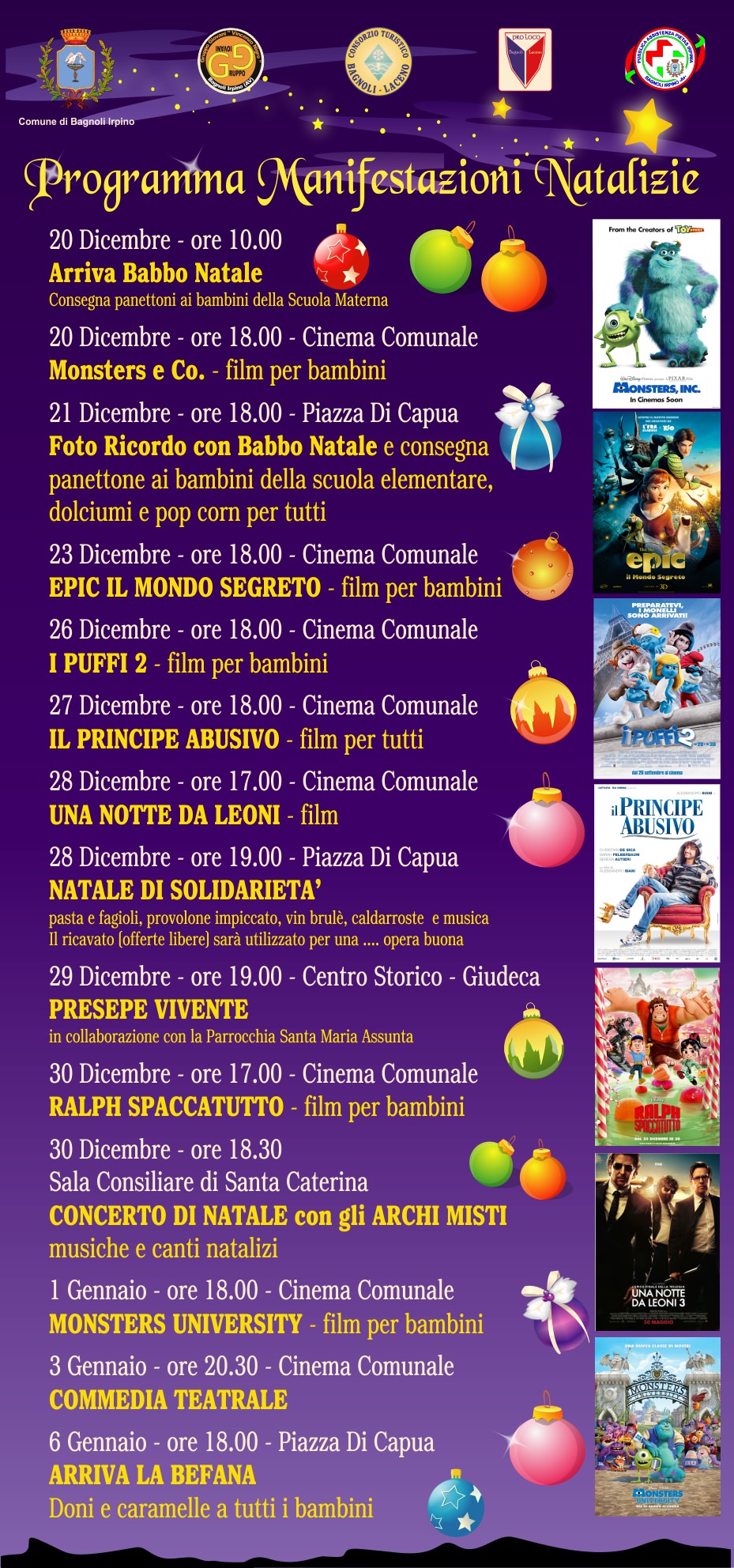 Il 20-23-26-27-28-30 dicembre e 01 gennaio le serata dedicate ai film (in particolare per i bambini) presso il Cinema Comunale. Il 28 dicembre “Natale di Solidarieta” in Piazza Di Capua, con allestimento di stand gastronomici e tanta musica.
