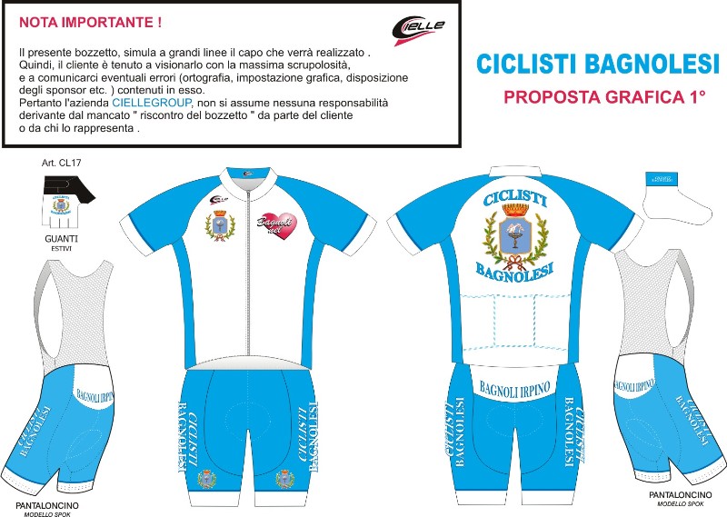Quella a seguire è la divisa ufficiale del gruppo “CICLISTI BAGNOLESI”, senza sponsor proprio per mettere in risalto lo stemma del comune di Bagnoli Irpino, da mostrare orgogliosamente per le strade della provincia e non solo. I colori sono il bianco e l’azzurro, con riferimento esplicito alla tradizione mariana della nostra cittadina. La speranza è quella che il progetto testé intrapreso vada avanti, e che si possa completare la DIVISA anche con la versione invernale (magari con l’aiuto di imprenditori che ci vorranno aiutare sponsorizzandoci).