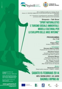PROGRAMMA –  Saluti: Filippo Nigro, Sindaco di Bagnoli Irpino. Intervengono: Giovanni Maria Chieffo, Presidente del Consorzio GAL Irpinia; Salvatore Farace, Docente di Economia Politica Università  degli Studi di Salerno; Vincenzo Manco, Presidente Nazionale UISP Unione Italiana Sport per tutti; On. Filippo Fossati, Componente Commissione Affari Sociali Camero del deputati.