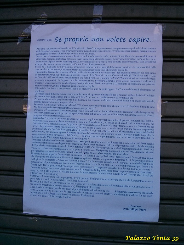Perciò c’è il manifesto e c’è il volantino, affinché sia chiara a tutti la linearità delle nostre decisioni e la responsabilità delle nostre scelte. In particolare, è necessario fare chiarezza sulla questione del III impianto di risalita. Il manifesto affisso dall’ex Assessore Caputo evidenzia una palese “non conoscenza” dell’argomento trattato, e la cosa suona alquanto strana per uno che fino a pochi mesi fa era parte della Giunta in carica. Viene da chiedergli:”Sai di che parli?”. Già nel Gennaio 2013 ha dichiarato testualmente in una nota di replica a Giuseppe De Mita “l’Amministrazione comunale ha già presentato e depositato in Regione tutta la documentazione necessaria affinché possa essere finanziato e realizzato il progetto”. Una sciocchezza, poiché il progetto depositato nel 2009 prevedeva il III impianto di risalita ma era privo dei permessi necessari, quindi la documentazione non era in regola.