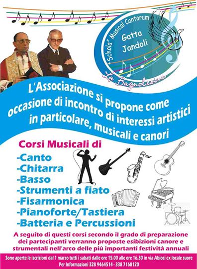 Lo scorso mese a Bagnoli è nata l’associazione Schola Musical Cantorum Gatta-Iandoli La Bagnolesina.La scuola nasce da un’idea di Domenico Nigro (detto Vitellino) e la scelta di dedicarla a Donato Gatta e Don Remigio Maria Jandoli scaturisce dall’influenza che questi due personaggi hanno avuto nella vita di Domenico.