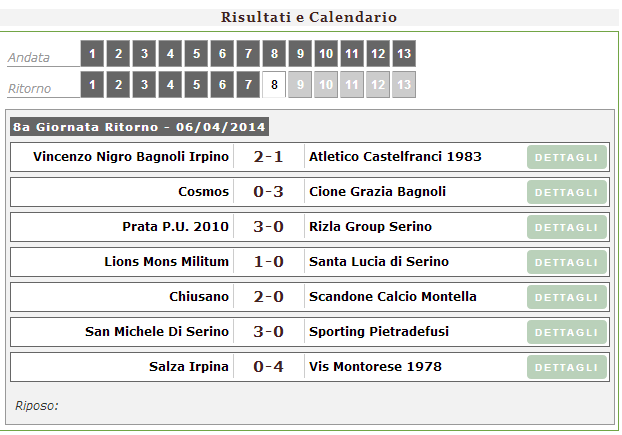 Il Vincenzo Nigro vince e si riporta in vetta, dividendo il podio con il Prata. A farne le spese è il fanalino di coda Atletico Castelfranci che capitola per due a uno sul campo del Bagnoli. Nel primo tempo gara dominata dal Bagnoli che al40 esimo trova la rete del vantaggio con Nigra A., Gatta sulla destra mette la palla in mezzo per Nigro A., che insacca alle spalle di Schiavone.