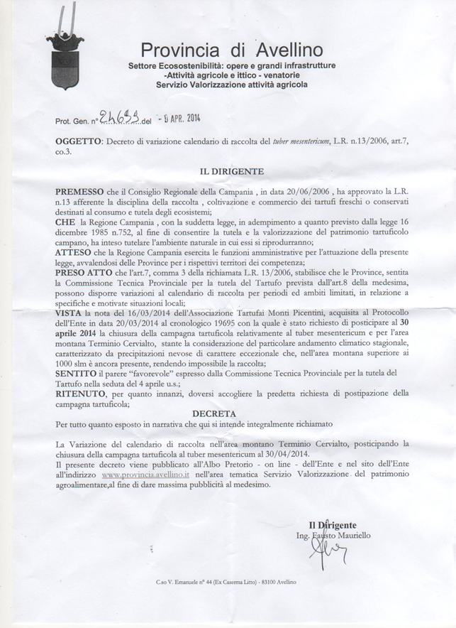 IL DIRIGENTE PROVINCIALE, Settore Ecosostenibilità, DECRETA la variazione del calendario di raccolta del tartufo nero di Bagnoli (tuber mesentericum) nell’Area montano Terminio Cervialto, posticipando la chiusura della campagna tartuficola al 30/04/2014.
