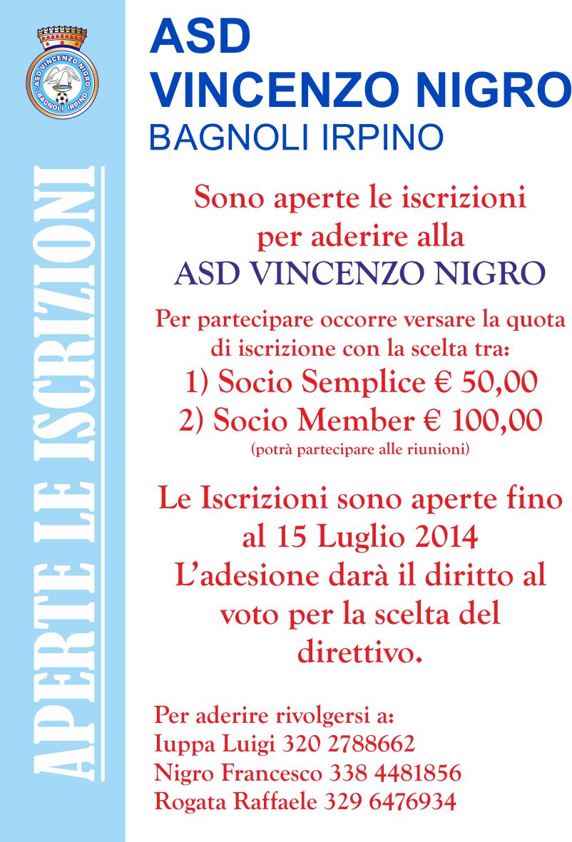 L’ ASD Vincenzo Nigro comunica che sono aperte le iscrizioni alla società sportiva stagione 2014-2015. Per aderire occorre versare la quota sociale pari ad euro 50,00 per lo status di Socio Semplice ed euro 100,00 per quello di Socio Member (quest’ultimo potrà partecipare anche alle riunioni). Tutti gli iscritti avranno diritto di voto per la scelta del nuovo Direttivo.