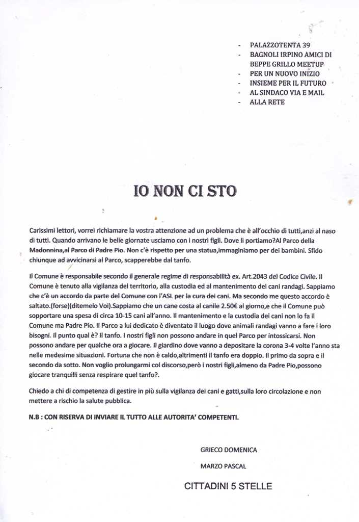 Carissimi lettori vorrei richiamare la vostra attenzione ad un problema che è all’ occhio di tutti, anzi al naso di tutti. Quando arrivano le belle giornate usciamo con i nostri figli. Dove li portiamo? Al Parco della Madonnina, al Parco di Padre Pio. Non c’è rispetto per una statua, immaginiamo per dei bambini. Sfido chiunque ad avvicinarsi al Parco, scapperebbe dal tanfo.