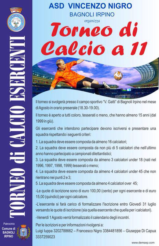 L’ASD Vincenzo Nigro organizza un torneo di calcio amatoriale per il mese di agosto. Il torneo si svolgerà presso il campo sportivo “V. Gatti” di Bagnoli Irpino in orario preserale (18.30-19.00). Il torneo è aperto a tutti coloro, tesserati o meno, che hanno almeno 15 anni (dal 1999 in giù).