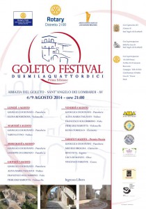 Il “GOLETO FESTIVAL”, fortemente voluto dal Rotary Club Sant’Angelo dei Lombardi Hirpinia – Goleto, ed in particolare dal suo presidente dott. Angelo Rossi, risponde pienamente ai principi ispiratori del Rotary: essere utili alla propria comunità, vivere la propria comunità. Tutto questo per la crescita e lo sviluppo del territorio in cui viviamo per far sì che i nostri paesi ricchi di storia, arte, bellezze naturali ed eccellenze eno – gastronomiche possano dare un futuro alle nostre piccole comunità ed ai nostri giovani e non essere solo territori di anziani, territori che puntualmente tornano alla ribalta per l’elevato numero di suicidi, segno di malessere e abbandono.
