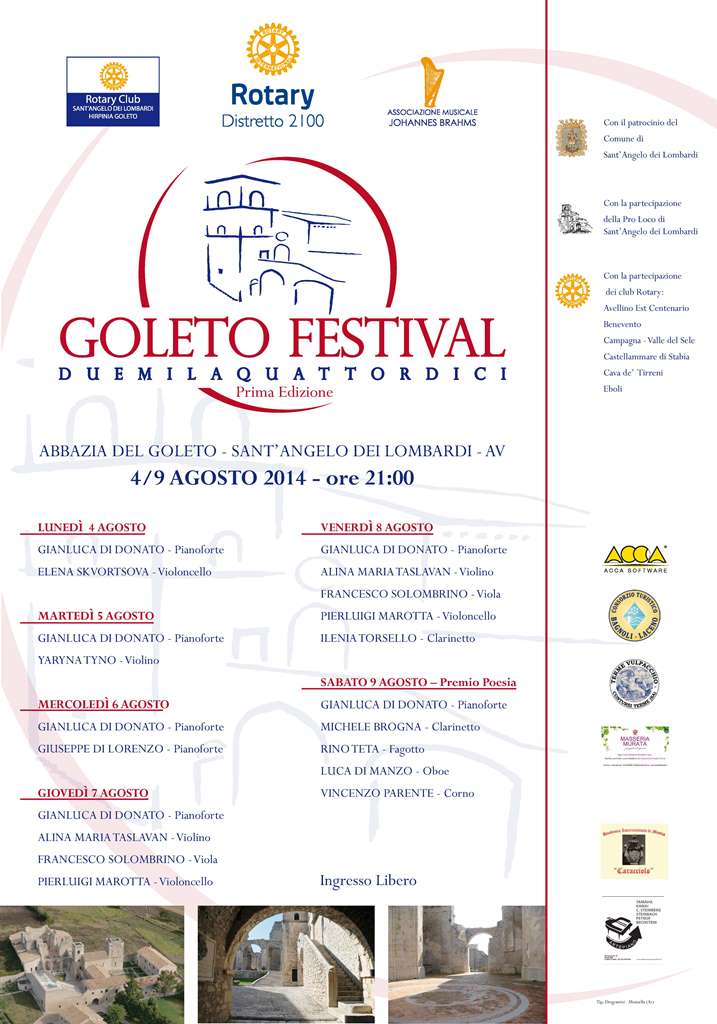 Il Rotary Club Sant’Angelo dei Lombardi Hirpinia – Goleto in collaborazione con l’associazione internazionale “J.Brahms” ha organizzato il primo “GOLETO FESTIVAL”: dal 4 al 9 agosto giovani artisti italiani ed internazionali di indiscusso talento si esibiranno all’interno della millenaria Abbazia del Goleto nella chiesa seicentesca del Vaccaro.