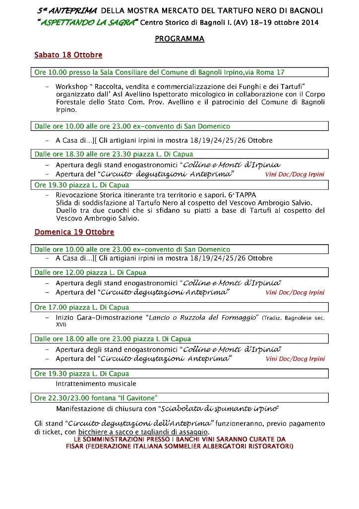 A partire dalle 18,30 ci sarà degli stand enogastronomici “Colline e Monti d’Irpinia” e del “Circuito degustazioni Anteprima”. L’evento proseguirà anche il giorno successivo, domenica 19, sempre con degustazioni e stand gastronomici. Ad arricchire la giornata vi sarà la Gara-Dimostrazione “Lancio o Ruzzola del Formaggio”, antica tradiione bagnolese del sec. XVI.