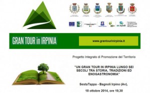 Giunge alla sua ultima tappa l’evento itinerante “Un Gran Tour in Irpinia lungo sei secoli tra storia, tradizioni ed enogastronomia”, finanziato nell’ambito del PSR Campania 2007/2013 – Interventi cofinanziati dal FEASR, Piano di Sviluppo Locale del GAL IRPINIA – MISURA 313 “Incentivazione di attività turistiche”, che chiuderà il suo lungo percorso presso il comune di Bagnoli Irpino, sabato 18 ottobre. A partire dalle 19,30.