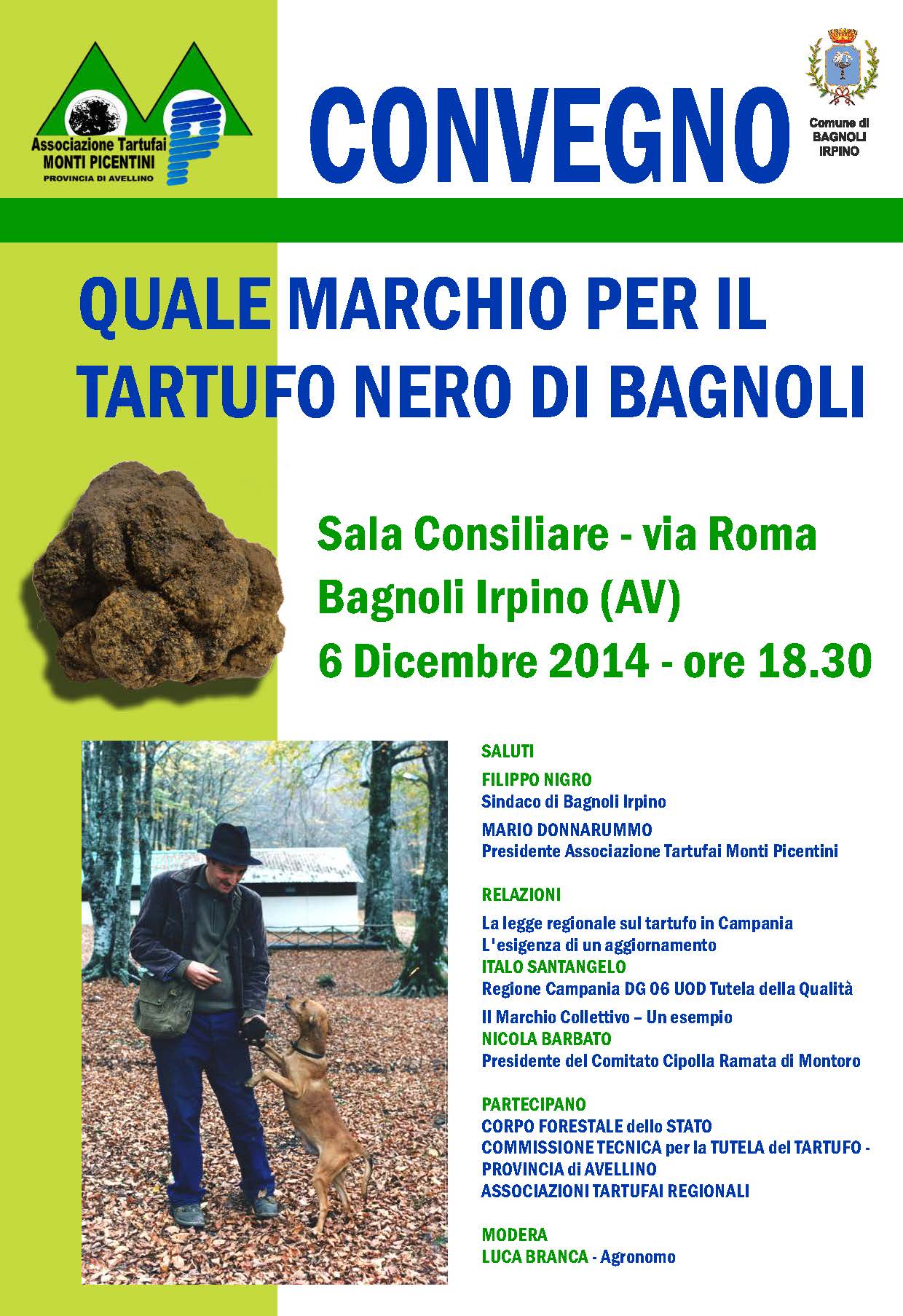 L’Associazione Tartufai del Monti Picentini, con il patrocinio del Comune di Bagnoli Irpino, organizza per sabato 6 dicembre ore 18:30 presso la Sala Consiliare in Via Roma un convegno dal titolo “Quale marchio per il tartufo nero di Bagnoli”. Saluti del sindaco di Bagnoli dott. Filippo Nigro e del presidente dell’associazione tartufai Mario Donnarummo.