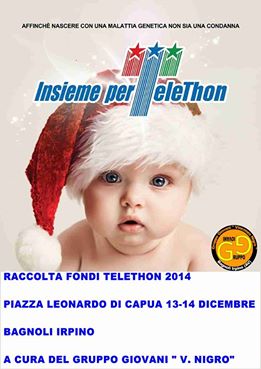 Quarto anno consecutivo di raccolta fondi per Telethon da parte del Gruppo Giovani Vincenzo Nigro di Bagnoli Irpino. Nel prossimo fine settimana, nei giorni 13 e 14 dicembre in Piazza Leonardo di Capua, Vincenzo Grieco, presidente dell’associazione,  e il suo infaticabile entourage sarà impegnato a fare opera di sensibilizzazione, distribuendo i prodotti solidali e i gadget di Telethon per sostenere la ricerca sulla distrofia muscolare e le altre malattie genetiche.