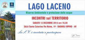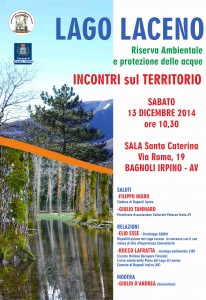 L’Associazione socio-culturale “Palazzo Tenta 39”, con il patrocinio del Comune di Bagnoli Irpino, organizza un convegno dal tema: “Lago Laceno: riserva ambientale e protezione delle acque. Incontri sul territorio”. L’appuntamento è per SABATO 13 DICEMBRE 2014 ore 10,30 presso la Sala Consiliare di Santa Caterina in Via Roma a BAGNOLI IRPINO.