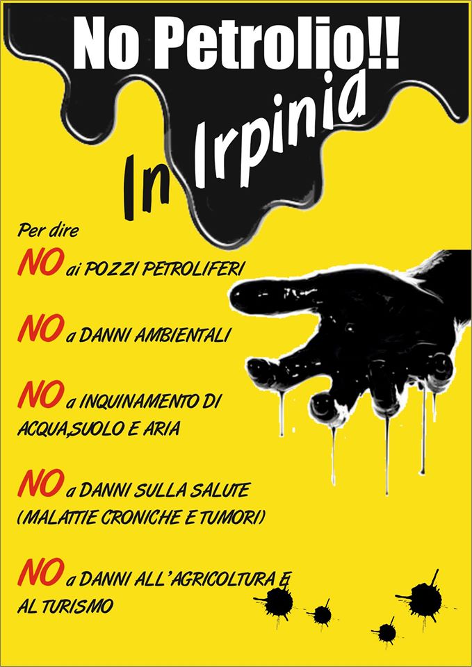 L’irpinia non è il Texas: il Petrolio distruggerà la nostra agricoltura e danneggerà i nostri marchi pregiati (DOCG, DOC, DOP). Proteggiamo il nostro vero ORO: il vino, l’olio, le nocciole, le castagne, i tartufi. I nostri animali, i formaggi, il turismo e l’acqua. E’ nostro dovere proteggere il futuro dei nostri figli.