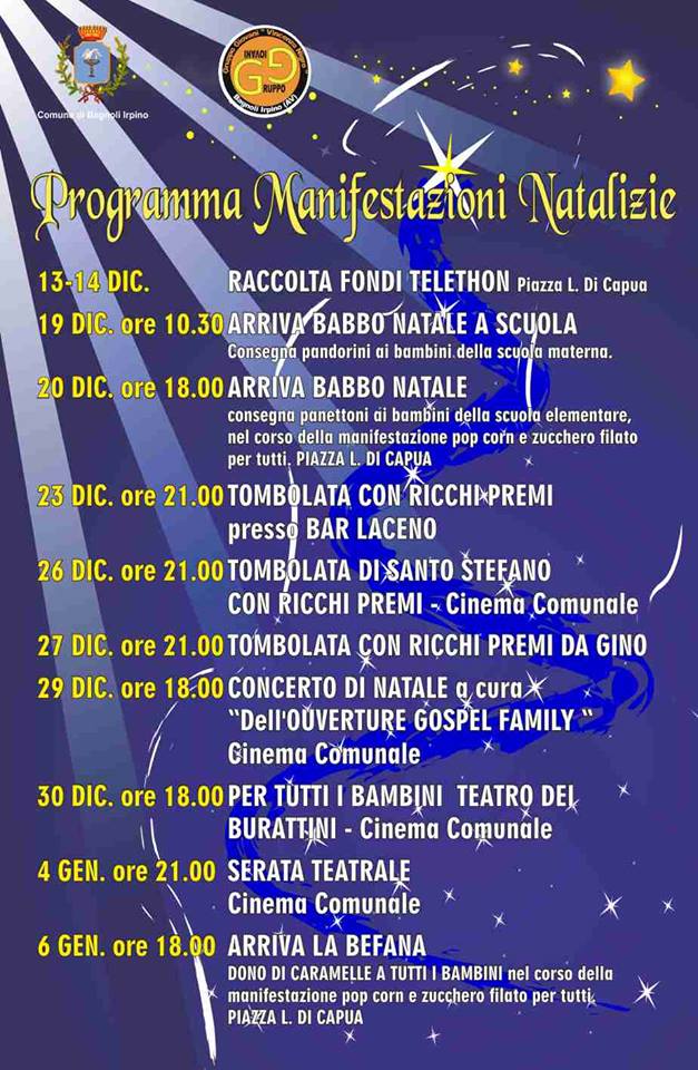 Dopo le tombolate si darà spazio all’opera il 29 con il “Concerto di Natale” a cura dell’ “Ouverture Gospel Family”: un coro composto da 20 persone che allieteranno la serata (ore 21:00) e che hanno cantato anche al Teatro Carlo Gesualdo di Avellino. Dopo il coro gospel il giorno dopo (30 dicembre) presso il Cinema Comunale i più piccoli saranno invitati a partecipare al “Teatro dei Burattini” con inizio alle ore 18:00. Dopo i festeggiamenti del nuovo anno altre due date a cura del Gruppo Giovani: il 4 gennaio sarà messa in scena una serata teatrale presso il Cinema Comunale e il 6 gennaio alle 18:00 “Arriva La Befana” in Piazza Leonardo Di Capua che donerà caramelle, zucchero filato e popcorn. L’impegno del Gruppo Giovani è sempre straordinario e non si limita solo al teatro, ma nel corso dell’anno è impegnato a 360° nel volontariato, nell’intrattenimento e nella creazione di eventi.