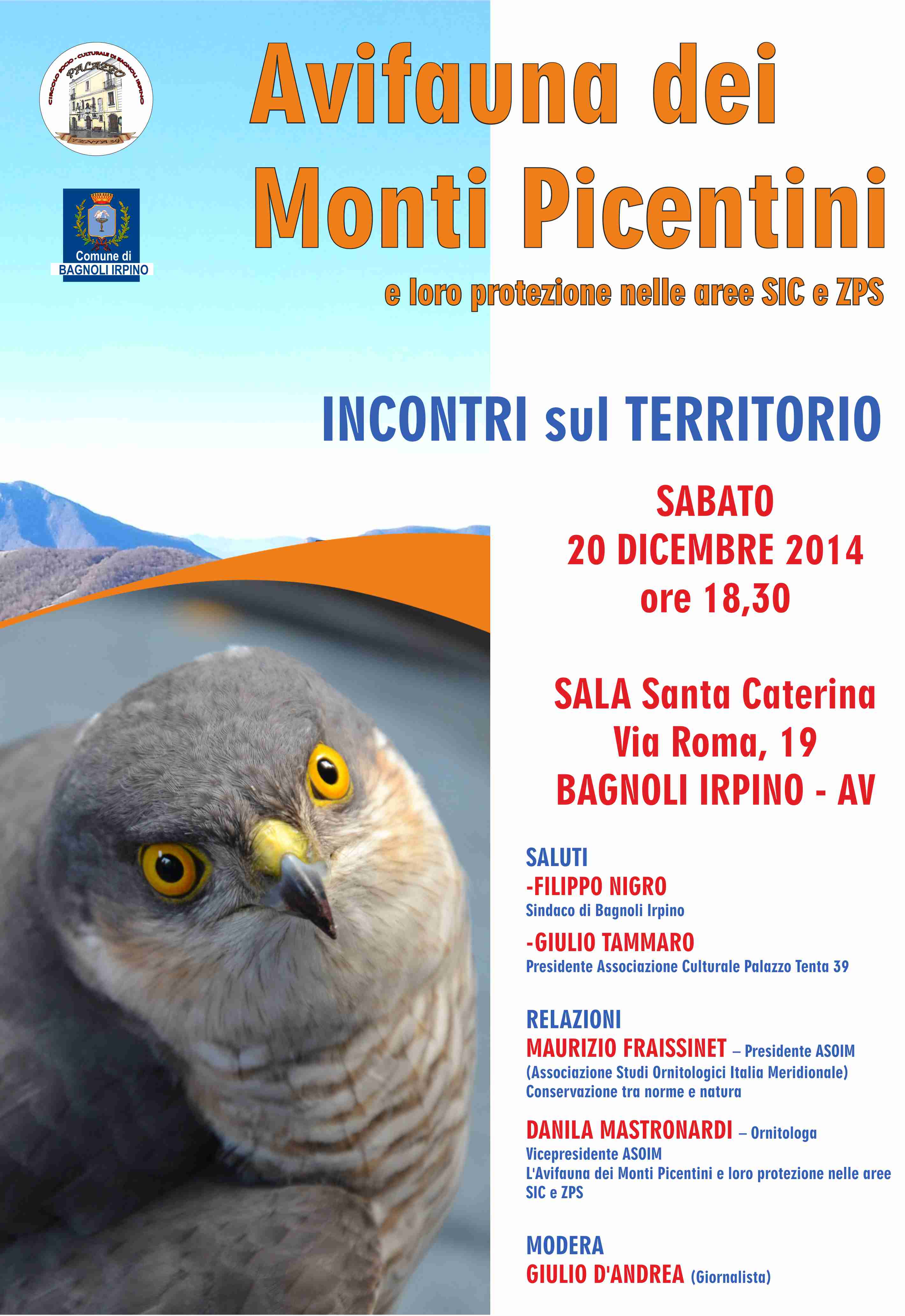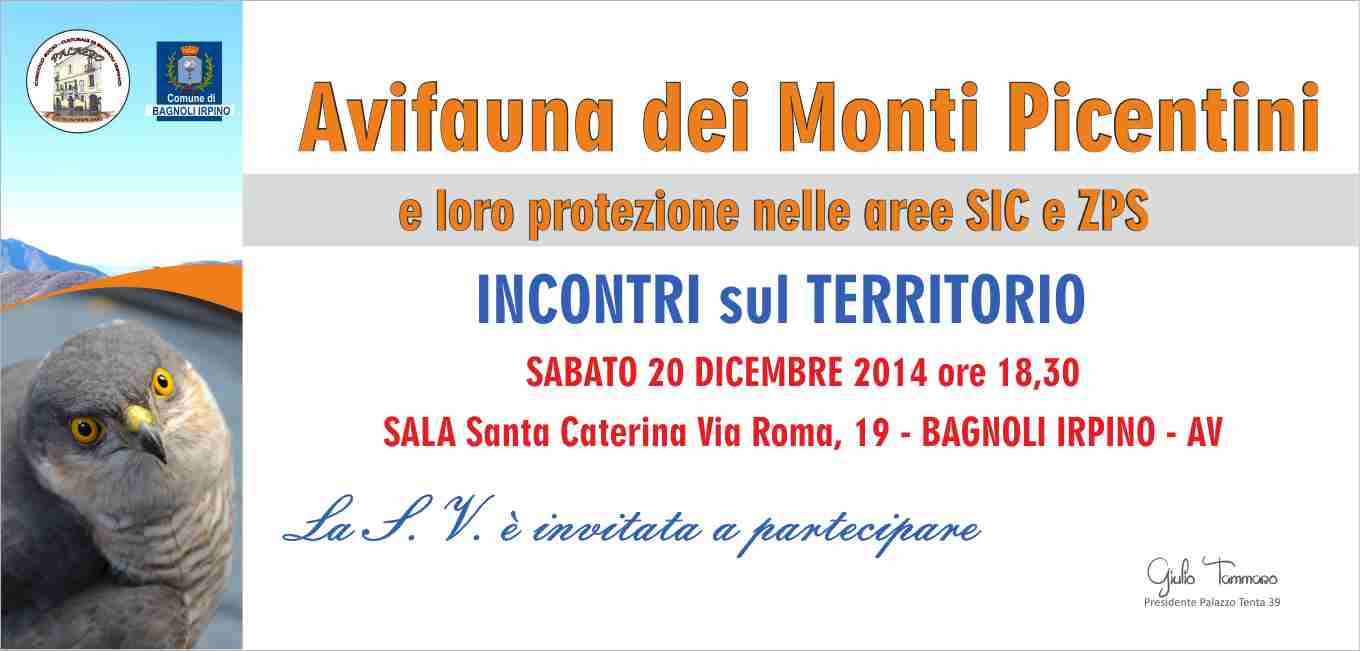 ’Associazione socio-culturale “Palazzo Tenta 39″, con il patrocinio del Comune di Bagnoli Irpino, organizza un convegno dal tema: “Avifauna dei Monti Picentini e loro protezione nelle aree SIC e ZPS”. Incontri sul territorio. L’appuntamento è per SABATO 20 DICEMBRE 2014 ore 18,30 presso la Sala Consiliare di Santa Caterina in Via Roma a BAGNOLI IRPINO.