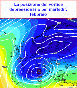 Da mercoledì 4 febbraio una depressione che arriverà dall’atlantico settentrionale, inseritasi nel flusso di correnti nord-occidentali, interesserà la nostra penisola. Sarà preceduta da venti sud-occidentali che faranno aumentare le temperature soprattutto sulle regioni centro-meridionali. In virtù di tale situazione riteniamo che il tempo in Italia possa essere così sintetizzato: