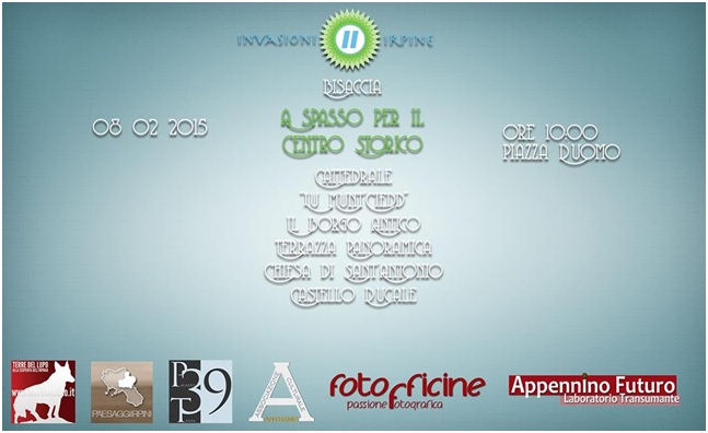 “All’ombra del Papa e dell’Imperatore, ci riuniremo in Piazza Duomo a Bisaccia. Ad accogliere gli Invasori ci sarà una guida, visiteremo la Cattedrale per poi, successivamente, salire per le “scalèdd” fin lassù, a “lu munt’cièdd”, che posa il suo sguardo sul borgo dormiente del centro antico. Con un balzo in via Forno Giardino, carezzeremo il fianco del paese lungo Corso Garibaldi, arrivando fino al cuore, laggiù, in Largo Valle. Proseguiremo fino al grande tiglio che con i suoi rami abbraccia Piazza Convento e la sua splendida terrazza panoramica, qui visiteremo la Chiesa di S. Antonio. Continueremo il cammino che ci porta a Largo Carmine sotto lo sguardo della maestosa torre, potremo visitare la Chiesa del Carmine e salendo “re fòrge” saluteremo sua maestà il Castello Ducale di Bisaccia. Da segnalare la mostra del concorso fotografico “Aria-Acqua-Terra-Fuoco” degli amici di FOTOFFICINE e la premiazione, sempre al Castello Ducale di Bisaccia”.Ad attenderci le attività di APPENNINO FUTURO. Laboratorio transumante” che si svilupperanno per tutta la giornata dell’8 febbraio 2015.