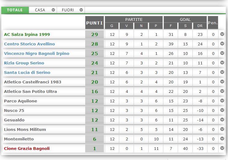 Dunque alla fine del girone di andata il Salza si laurea campione d’inverno con 29 punti, frutto di 9 vittorie, due pareggi e una sola sconfitta, subìta proprio a Bagnoli. I goal fatti sono stati 31 quelli subìti appena 8. Al secondo posto il Centro Storico Avellino con 28 punti, 9 le vittorie, 1 i pareggi e 2 le sconfitte. I goal fatti 39 i subìti 15. Al terzo posto l’ASD V. N.Bagnoli con 25 punti, 7 le vittorie, 4 i pareggi e 1 sconfitta. I goal fatti 26 i subìti 10. La classifica marcatori vede con 12 reti Tecce Marco del Salza, Infante del Bagnoli e Iandoli del Centro Storico con 10 reti, Fierro del Bagnoli con 8 reti.