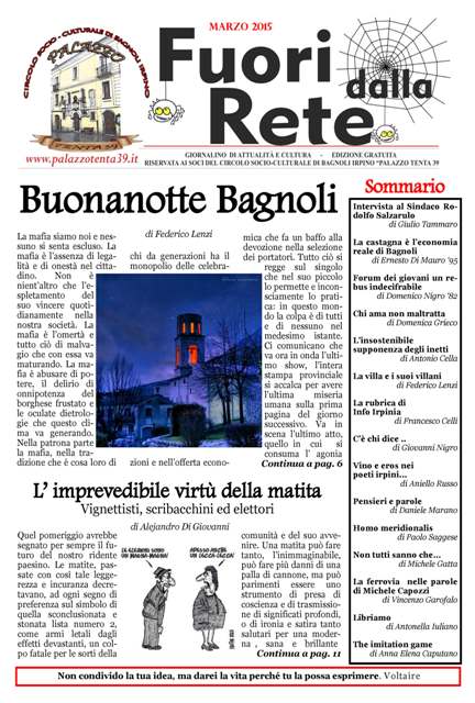 E’ in uscita domenica 01 marzo “FUORI DALLA RETE”, il 2° numero 2015 del giornale di informazione ed approfondimento del Circolo socio-culturale “Palazzo Tenta 39″. La distribuzione, riservata agli associati, avverrà in Piazza Leonardo Di Capua a Bagnoli Irpino a partire dalle ore 10:30.