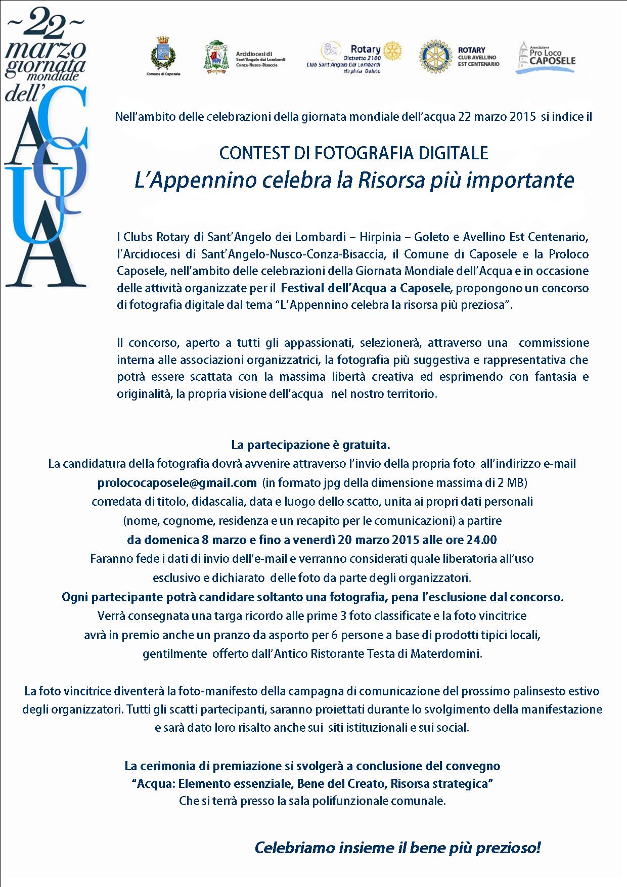 I Clubs Rotary di Sant’Angelo dei Lombardi – Hirpinia – Goleto e Avellino Est Centenario, l’Arcidiocesi di Sant’Angelo-Nusco-Conza-Bisaccia, il Comune di Caposele e la Proloco Caposele, nell’ambito delle celebrazioni della Giornata Mondiale dell’Acqua e in occasione delle attività organizzate per il Festival dell’Acqua a Caposele, propongono un concorso di fotografia digitale dal tema “L’Appennino celebra la risorsa più preziosa”.