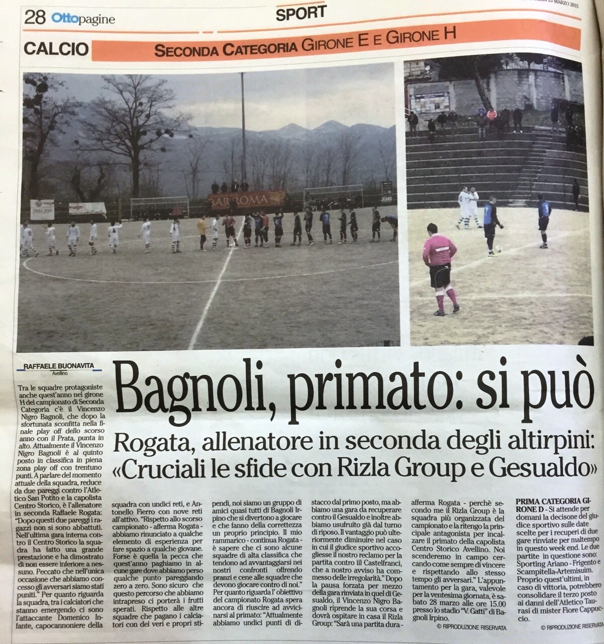 Tra le squadre protagoniste anche quest’anno nel girone H del campionato di Seconda Categoria c’è il Vincenzo Nigro Bagnoli, che dopo la sfortunata sconfitta nella finale play off dello scorso anno con il Prata, punta in alto. Attualmente il Vincenzo Nigro Bagnoli è al quinto posto in classifica in piena zona play off con trentuno punti. A parlare del momento attuale della squadra, reduce da due pareggi contro Atletico San Potito e la capolista Centro Storico, è l’allenatore in seconda Raffaele Rogata:” Dopo questi due pareggi i ragazzi non si sono abbattuti. Nell’ultima gara interna contro il Centro Storico la squadra ha fatto una grande prestazione e ha dimostrato di non essere inferiore a nessuno. Peccato che nell’unica occasione che abbiamo concesso gli avversari, siamo stati puniti.” Per quanto riguarda la squadra, tra i calciatori che stanno emergendo ci sono l’attaccante Domenico Infante, capocannoniere della squadra con undici reti, e Antonello Fierro con nove reti all’attivo. “Rispetto allo scorso campionato – afferma Rogata – abbiamo rinunciato a qualche elemento di esperienza per fare spazio a qualche giovane. Forse è quella la pecca che quest’anno paghiamo in alcune gare dove abbiamo perso qualche punto pareggiando zero a zero. Sono sicuro che questo percorso che abbiamo intrapreso ci porterà i frutti sperati.