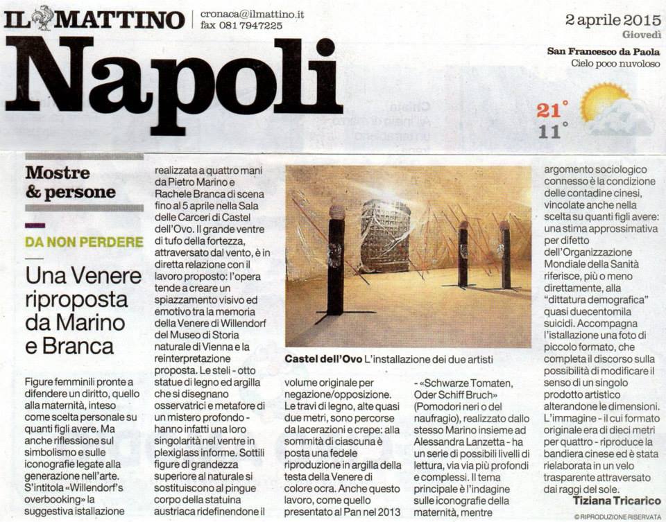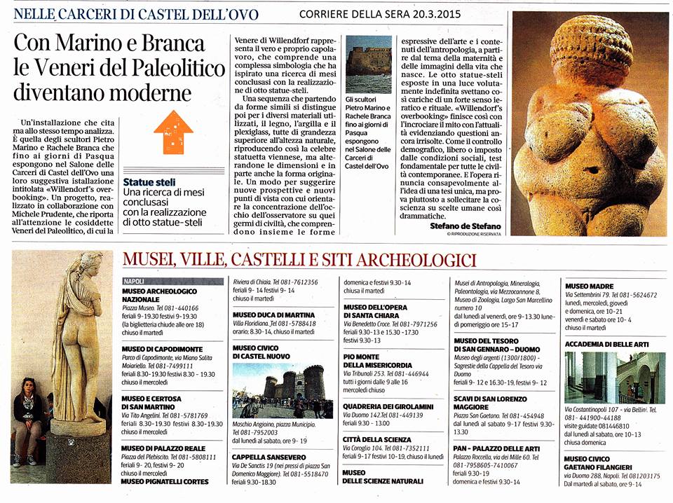 Un’installazione che cita ma allo stesso tempo analizza. E’ quella degli scultori Pietro Marino e Rachele Branca che fino al giorni di Pasqua espongono nel Salone delle Carceri di Castel dell’Ovo una loro suggestiva istallazione intitolata «Willendorf’s overbooking». Un progetto realizzato in collaborazione con Michele Prudente, che riporta all’attenzione le cosiddette Veneri del paleolitico, di cui la Venere di Willendorf rappresenta il vero proprio capolavoro, che comprende una complessa simbologia che ha ispirato una ricerca di mesi conclusasi con la realizzazione di otto statue-stelil.