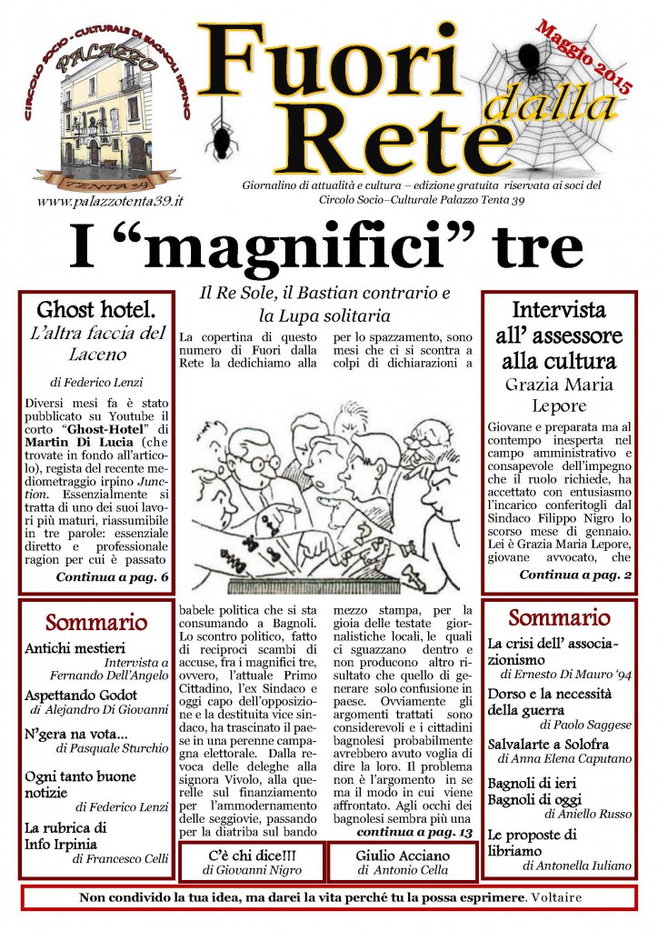 E’ in uscita domenica 03 maggio “FUORI DALLA RETE”, il 3° numero 2015 del giornale di informazione ed approfondimento del Circolo socio-culturale “Palazzo Tenta 39″. La distribuzione, riservata agli associati, avverrà in Piazza Leonardo Di Capua a Bagnoli Irpino a partire dalle ore 10:30.