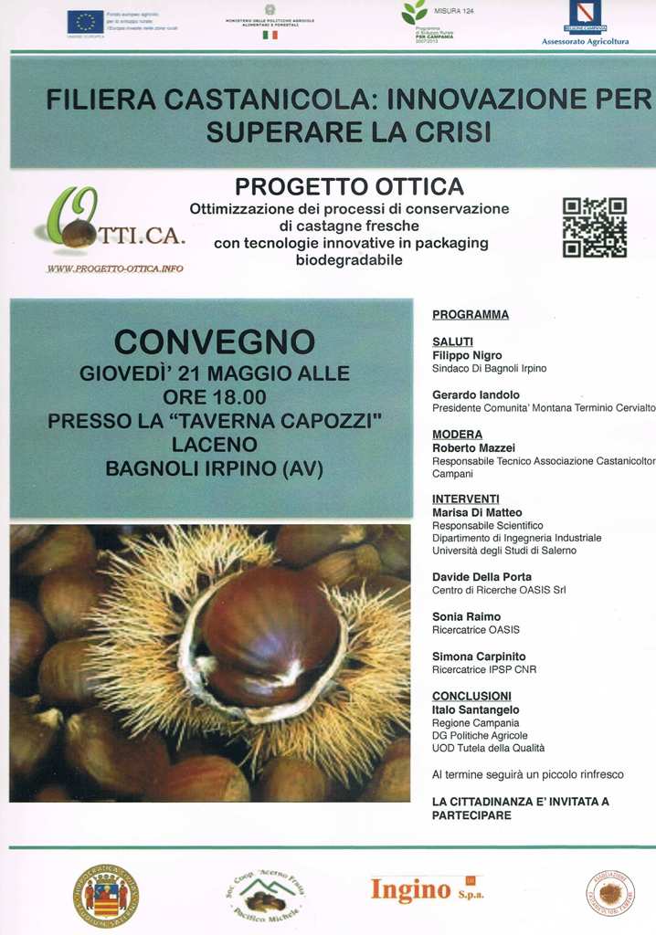PROGRAMMA – Saluti: Filippo Nigro, sindaco di Bagnoli Irpino; Gerardo Iandolo, Presidente Comunità Montana Terminio-Cervialto. Modera: Roberto Mazzei, Responsabile Tecnico Associazione Castanicoltori Campani. Interventi: Marisa Di Matteo, Responsabile Scientifico Dipartimento di Ingegneria Industriale presso l’Università degli Studi di Salerno. Davide Della Porta, Centro di Ricerche OASIS srl; Sonia Raimo, Ricercatrice OASIS; Simone Carpinito, Ricercatrice IPSP CNR. Conclusioni: Italo Santangelo, Regione Campania DG Politiche Agricole UOD Tutela della Qualità.