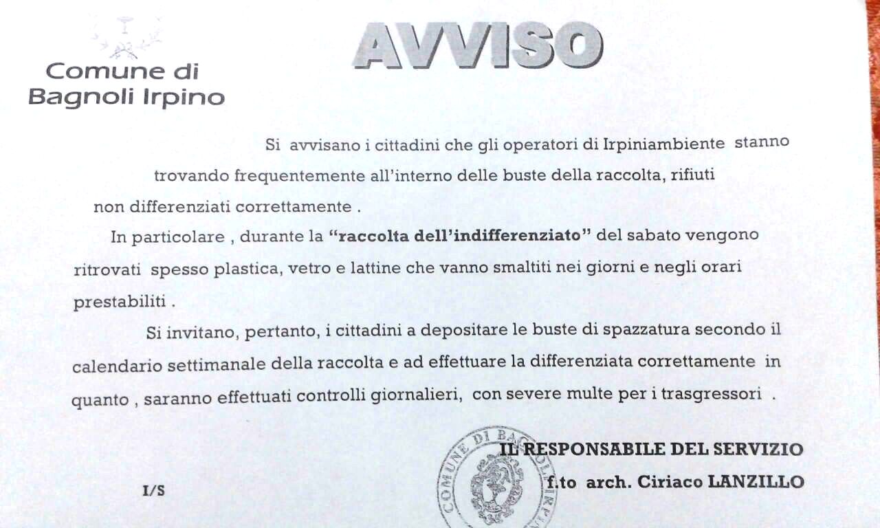Si invitano, pertanto, i cittadini a depositare le buste di spazzatura secondo il calendario settiamanale della raccolta e ad effettuare la differenziata in quanto, saranno effettuati controlli giornalieri, con severe multe per i trasgressori.