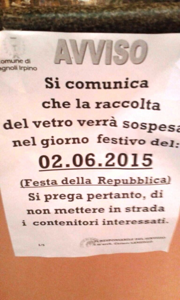 SOSPESA PER IL 2 GIUGNO (Festa della Repubblica) LA RACCOLTA DEL VETRO.