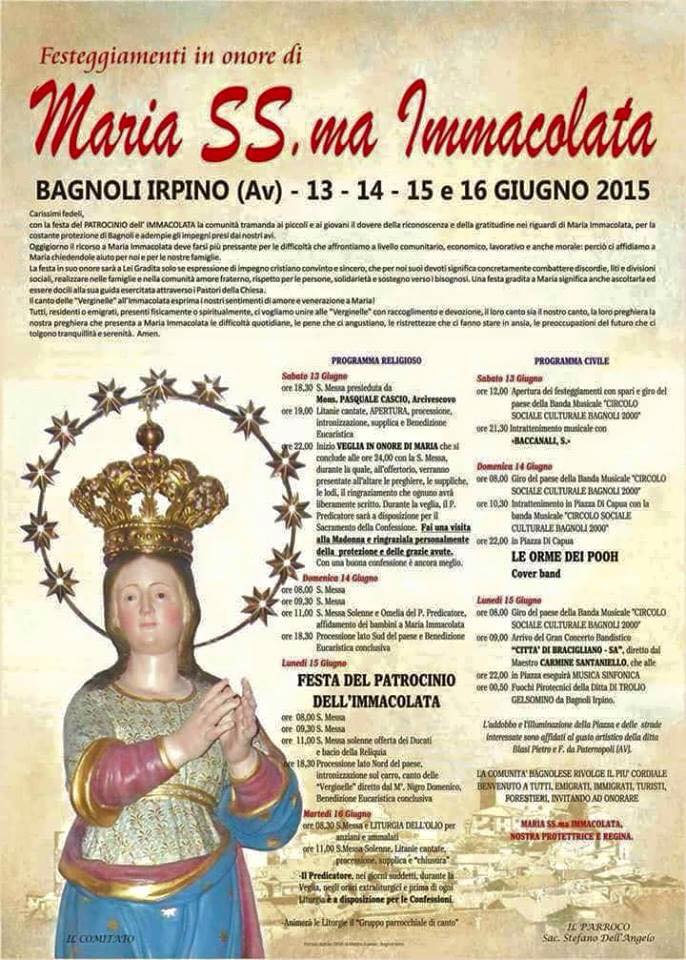 Carissimi fedeli, con la festa del PATROCINIO dell’ IMMACOLATA la comunità tramanda ai piccoli e ai giovani il dovere della riconoscenza e della gratitudine nei riguardi di Maria Immacolata, per la costante protezione di Bagnoli e adempie gli impegni presi dai nostri avi. Oggigiorno il ricorso a Maria Immacolata deve farsi più pressante per le difficoltà che affrontiamo a livello comunitario, economico, lavorativo e anche morale: perciò ci affidiamo a Maria chiedendole aiuto per noi e per le nostre famiglie.
